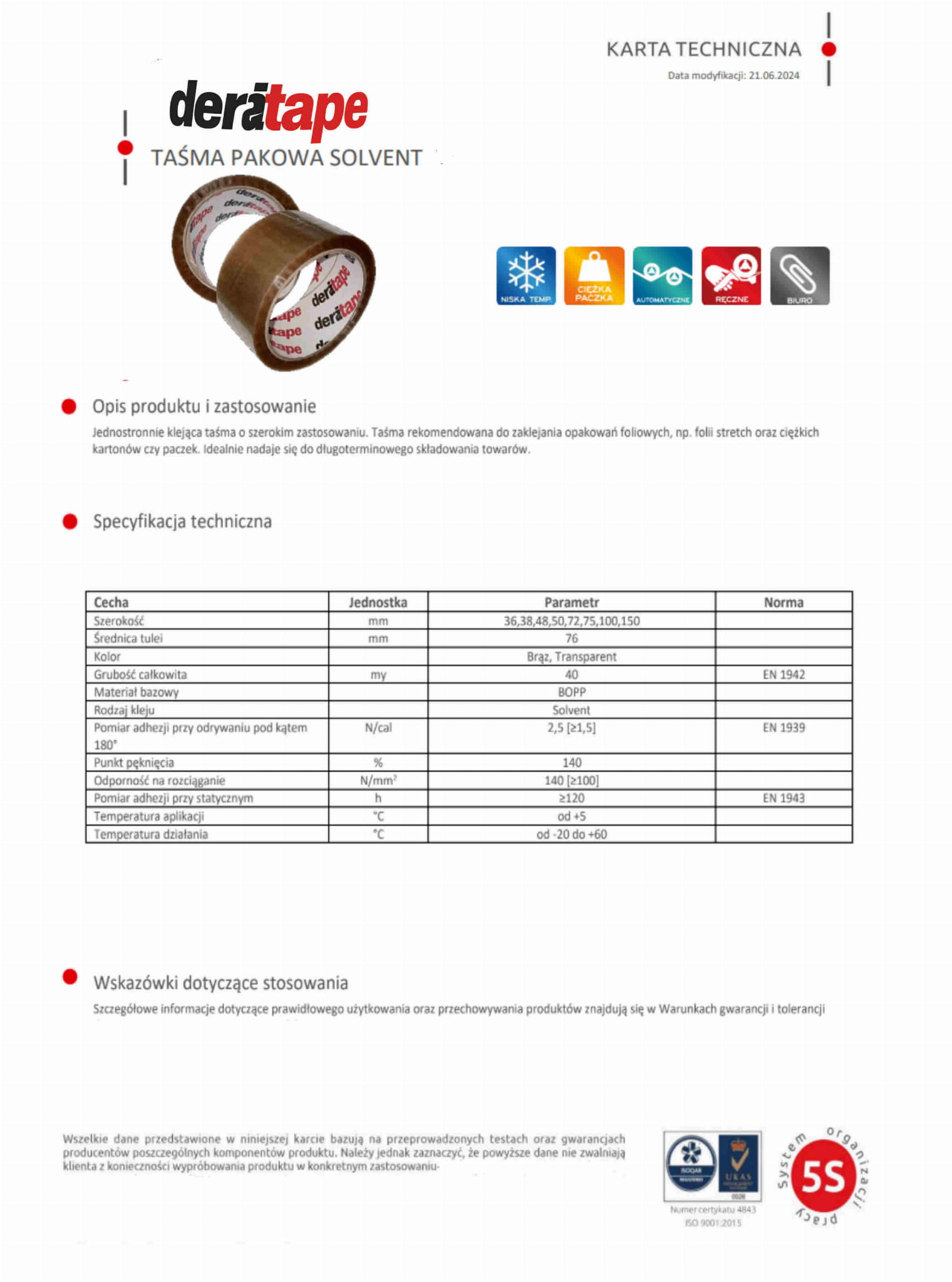 Taśma cechuje się odpornością na procesy starzenia oraz światło UV, nie odkleja się, mimo średniej grubości nośnika (folia) jest bardzo mocna, nie zrywa się, idealna do zastosowania przy pakowaniu dużych, ciężkich paczek. Pracuje w ekstremalnych warunkach, nawet przy -20 st. C. Spełnia w 100% oczekiwania dla jakości oklejania pod warunkiem, że zostanie starannie dociśnięta do powierzchni oklejanej, jest na Platformie abcmarket24.pl najtańszą taśmą z grupy taśm na naturalnym kleju kauczukowym - solvencie.